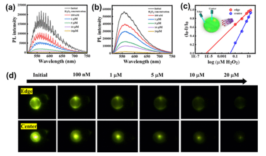 圖 8. (a, b) 增量添加 H2O2 時的 μ-PL 光譜,在微結構的邊緣和中心均施加激光激發。 (c) PL 強度隨過氧化物濃度對數的降低。 (插圖示意性地表示球體上的激光激發。)(d)μ-PL 圖像捕獲了微球體邊緣(上)和中心(下)從初始狀態到不同濃度 H2O2 的過程。 470 nm 脈沖激光作為激發光源。