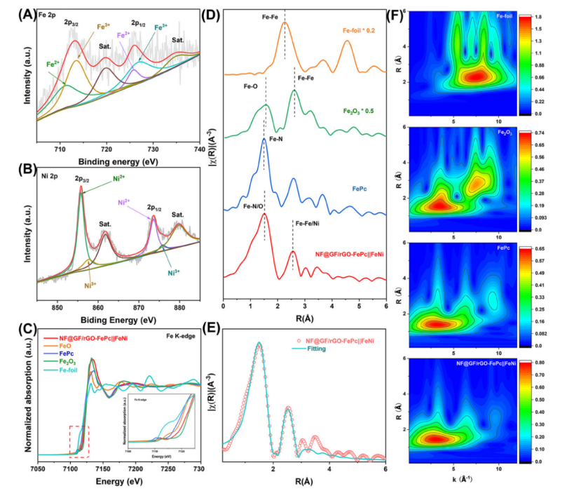 Fig 2. X 射線光電子能譜 (XPS) (A) NF@GF/rGO-FePc||FeNi 的 Fe 2p 和 (B) Ni 2p 光譜。(C) NF@GF/rGO-FePc||FeNi、FeO、FePc、Fe2O3 和 Fe 箔的歸一化 Fe K 邊 X 射線吸收近邊結構光譜(XANES)。 (D) NF@GF/rGO-FePc||FeNi 和參考樣品的 k2 加權傅立葉變換擴展 X 射線吸收精細結構(EXAFS)光譜。(E) NF@GF/rGO-FePc||FeNi 的傅立葉變換 EXAFS 擬合曲線。(F) Fe 箔、Fe