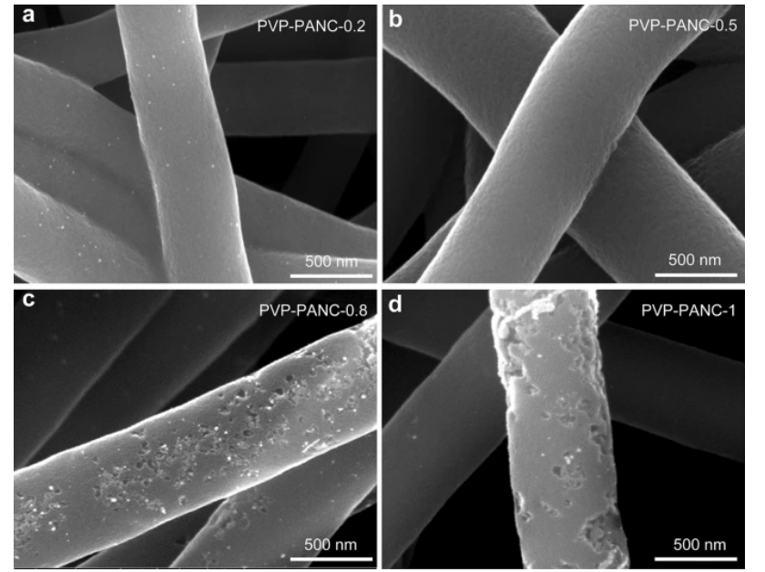 Fig 2. a PVP-PANC-0.2的掃描電鏡圖像;b PVP-PANC-0.5的掃描電鏡圖像;c PVP-PANC-0.8的掃描電鏡圖像;d PVP-PANC-1的掃描電鏡圖像。