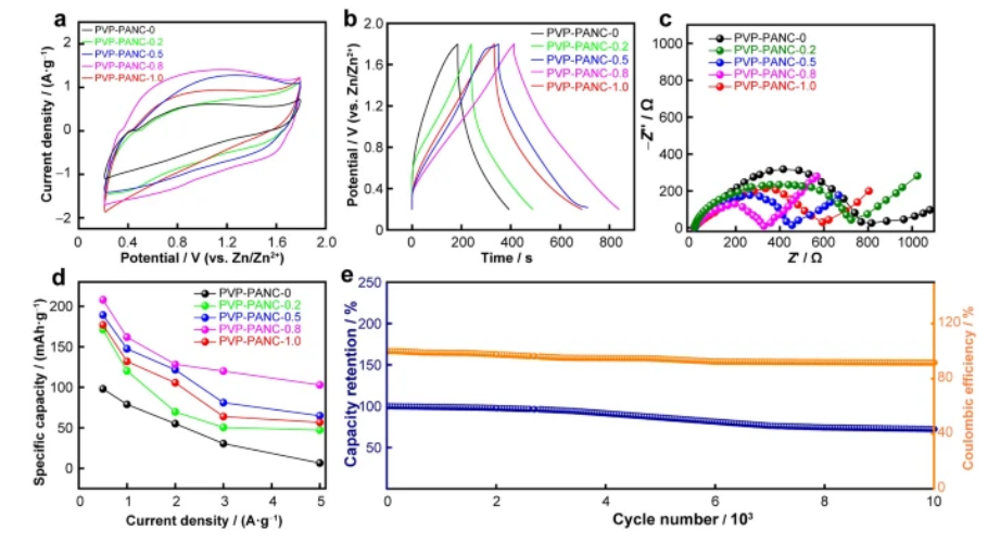 -1時的比容量;e PVP-PANC-0.8//Zn ZHS的循環穩定性。