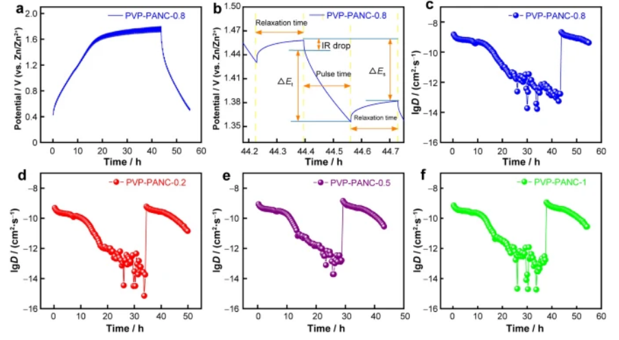 Fig 6. a GITT曲線;b GITT 曲線局部放大圖;c PVP-PANC-0.8//Zn ZHS 的鋅離子擴散系數;d PVP-PANC-0.2//Zn ZHS 的鋅離子擴散系數;e PVP-PANC-0.5//Zn ZHS 的鋅離子擴散系數;f PVP-PANC-1//Zn ZHS 的鋅離子擴散系數。