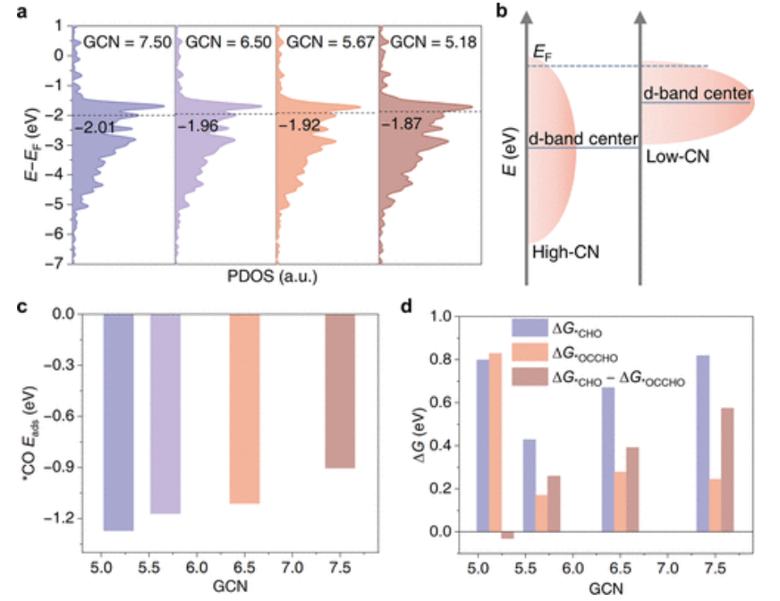 Fig 1. DFT計算。(A)不同GCN的銅的PDOS圖。(B)高CN金屬和低CN金屬的d帶中心和d帶寬示意圖。(C)銅的*CO-GCN吸附能圖。(D)ΔG
