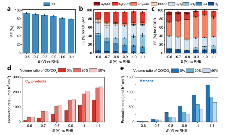 2+ 產(chǎn)物(包括乙烯、乙醇、醋酸酯和丙醇)和 (e) 甲烷(以 CO/CO