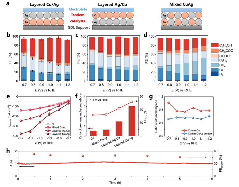 2+ 產(chǎn)物的 FEs 與 RHE 之比。(g) 商用銅微球(Comm-Cu)和 Comm-CuAg 串聯(lián)電極的乙醇與乙烯之比。(h) 在全電池電壓保持恒定為 3 V 的 MEA 系統(tǒng)中進行乙醇的電合成(在此電壓下乙醇的 FE 最高)。