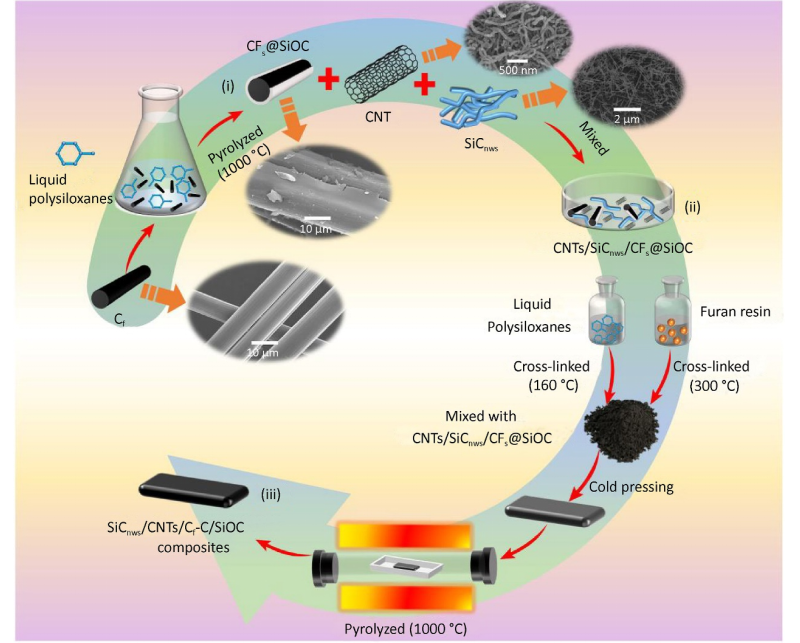 圖 1. SiCnws/CNTs/Cf-C/SiOC 復合材料的制備過程圖。