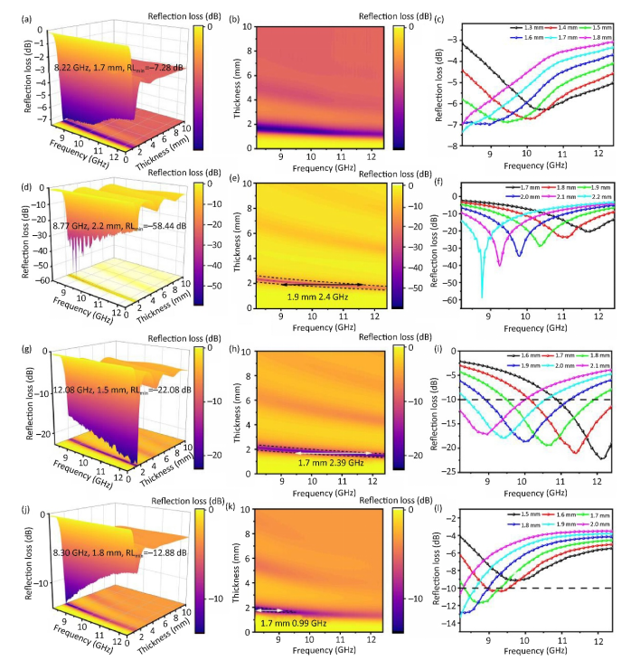 圖 4. 樣品 SCC-CS-1 (a, b)、SCC-CS-2(d, e)、SCC-CS-3(g, h) 和 SCC-CS-4(j, k) 在不同頻率和厚度下計算出的理論 RL 值和相應投影圖的 3D 圖。樣品特定厚度的 RL 值與頻率的關系 (c) SCC-CS-1、(f) SCC-CS-2、(i) SCC-CS-3 和 SCC-CS-4 (l)。