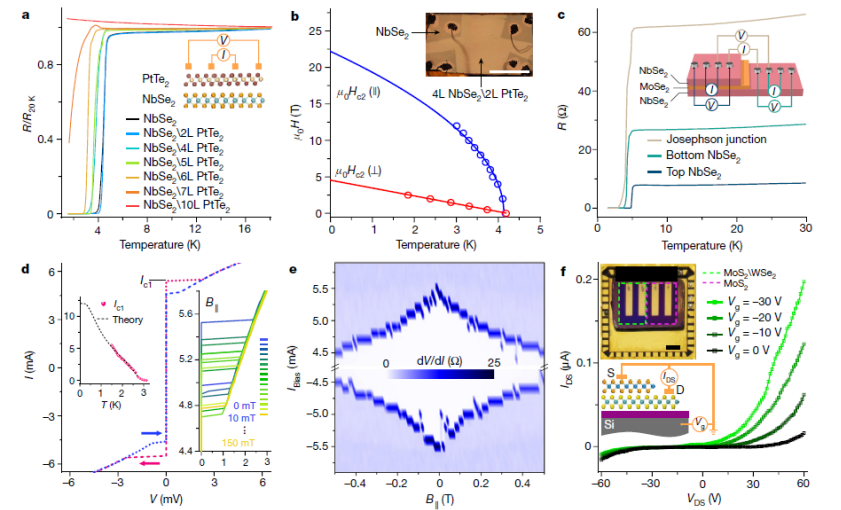 圖 4. 堆疊生長的 vdWSH 薄膜的層間耦合。a,堆疊生長的 NbSe2\PtTe2 薄膜的電阻溫度依賴性,其中 PtTe2 厚度不同。插圖顯示了電極設置。b,平面內(藍色)和平面外(紅色)磁場下上臨界場 Hc2 的溫度依賴性。實線是根據 Ginzburg-Landau 理論擬合的。插圖是毫米級 vdWSH 薄膜的典型光學圖像。比例尺,2 毫米。μ0,真空磁導率。c,4L NbSe2\2L MoSe2\4L NbSe2 薄膜中頂部和底部 4L NbSe2 的電阻溫度依賴性,以及頂部和底部 NbSe2 之間的結電阻。插圖顯示了 vdWSH 薄膜的四探針電測量裝置。 d、在 1.5 K 下測量的堆疊生長 4L NbSe2\2L MoSe2\4L NbSe2 vdWSH 薄膜的 I-V 特性。箭頭表示電流的掃描方向。左側插圖顯示臨界電流 Ic1 的溫度依賴性。虛線按照Ambegaokar-Baratoff 關系擬合。右側插圖顯示在不同 B∥ 下測量的放大比例的 I-V 曲線。e,在 1.5 K 溫度下 4L NbSe2\2L MoSe2\4L NbSe2 的微分電阻對偏置電流 (IBias) 和 B∥ 的依賴關系。f,在大型 3L MoS2\4L WSe2 p-n 結中測量的不同 Vg 下的 IDS-VDS 曲線。頂部插圖是制造的器件的光學圖像,金屬觸點之間的間距為 1 毫米。比例尺,2 毫米。底部插圖顯示了雙探針電氣測量的裝置。S,源極;D,漏極。