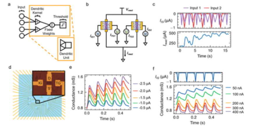圖3. 多個GrAD和μGrAD時間相關響應。(a)樹突單位的符號表示。(b)樹枝狀單元電路圖。(c)由兩個單獨輸入(紫色和紅色)的樹突組成的樹突單元的實驗輸出(藍色)。(d) μGrAD雙側門器件布局的光學顯微鏡圖像。(e)不同IIG值下的Alpha波形生成。(f)不同ITG值下的Alpha和高斯波形生成。