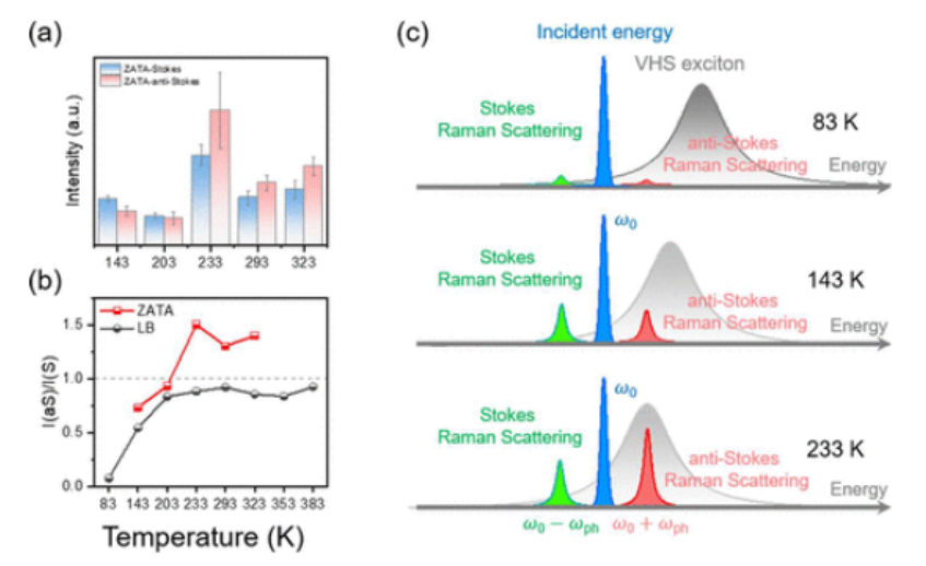 圖5. (a) ZATA模的Stokes和anti-Stokes散射強(qiáng)度隨溫度升高而增大。(b) 隨溫度升高ZATA和LB的Stokes散射和反Stokes散射的強(qiáng)度比。(c) vHS激子輔助ZATA反斯托克斯增強(qiáng)的可能機(jī)制。