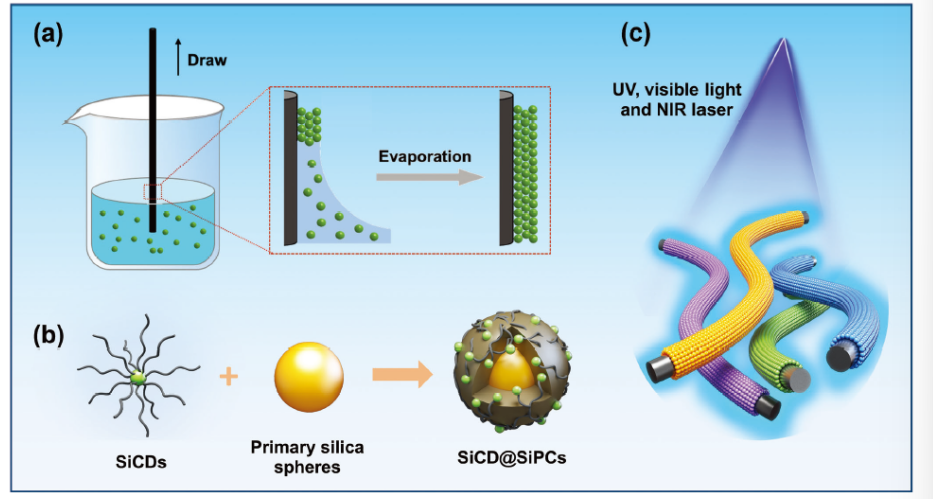 碳納米管 (CNT) 因其高導電性、化學穩定性、重量輕和高強度等獨特性質而在許多領域中需求量巨大。由于其在可見光下的超黑特性和紅外光的光熱效應,它們在光學相關領域也備受關注。最近,借助二氧化硅光子晶體 (PC) 涂層,通過簡單的液相法實現了可見光下 CNT 的著色。然而,尚未研究 CNT 對紅外和紫外 (UV) 波段的光致發光 (PL) 特性等響應調制。在此,將硅烷功能化碳點 (SiCD) 引入二氧化硅 PC 中,成功實現了 CNT 纖維 (CNTFs) 的結構著色和 PL。在 SiCDs 液滴的幫助下,還實現了單個 CNT 和懸浮 CNT 網絡 (SCNTNs) 的光學和熒光可視化。該類SiCDs修飾SiPCs包覆CNTFs(SiCDs@SiPCs-CNTFs)表現出上/下轉換PL響應,激發光源可以是紫外光、可見光和近紅外激光。結構著色和新PL性能的開發將推動PL碳雜化材料在智能顯示、智能紡織、防偽等許多領域的廣泛應用。