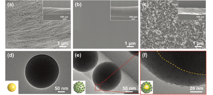 圖 2. SiCDs@SiPCs-CNTFs 的形貌表征。a–c) CNTFs (a)、SiCDs 涂覆的 CNTFs (b) 和 SiCDs@SiPCs-CNTFs (c) 的掃描電子顯微鏡 (SEM) 圖像。d) 不含 SiCD 的二氧化硅 PC 的透射電子顯微鏡 (TEM) 圖像。(e) SiCDs@SiPCs 的 TEM 圖像。SiCDs 溶液的添加量(5% 負載分數)為 3 mL。f) 圖 2e 中所示的 SiCDs@SiPCs 表面形貌的 TEM 圖像。可以清楚地觀察到添加 SiCD 之前的原始二氧化硅 PC 的邊緣。
