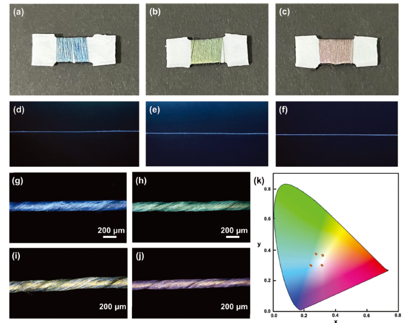 圖3. SiCDs@SiPCs-CNTFs的結構色和PL特性。a-c) 不同直徑的SiCDs@SiPCs涂覆的藍色(a)、綠色(b)、粉色(c)CNTF的照片。d-f) 365 nm紫外照射下藍色(d)、綠色(e)、粉色(f)SiCDs@SiPCs-CNTFs的照片(a-c)。它們表現出不同的結構色,但由于添加了相同的SiCD和不同尺寸的二氧化硅PC,因此都發出熒光。g-k) 四種典型結構色SiCDs@SiPCs-CNTFs的光學圖像(g-j)和CIE坐標(k):藍色(g)、綠色(h)、黃色(i)和紫色(j)SiCDs@SiPCs-CNTFs,分別對應210、245、280和305 nm的二氧化硅PC。