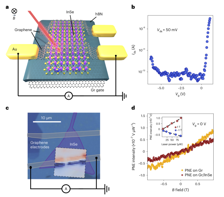 能斯特效應是一種橫向熱電現象,因其在能量轉換、熱電學和自旋電子學中的潛力而備受關注。然而,在低溫下實現高性能和多功能性仍然難以實現。在這里,我們通過在場效應幾何中將石墨烯的電特性與硒化銦的半導體特性相結合,展示了一種大型且電可調的能斯特效應。我們的研究結果為探索和操縱這種熱電效應建立了一個新平臺,展示了第一個開/關比為 103 的電可調性。此外,光電壓測量顯示,與單個組件相比,石墨烯/硒化銦異質結構中的光能斯特信號更強。值得注意的是,我們在超低溫和低磁場下觀察到創紀錄的 66.4 μV K-1 T-1 能斯特系數,這是邁向量子信息和低溫突發現象應用的重要一步。