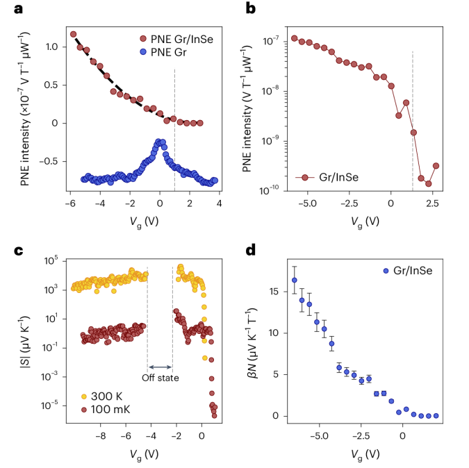 圖 2. a、用激光功率對 3L InSe/Gr 異質結構 (深紅色) 進行測量,將能斯特效應強度歸一化為柵極電壓的函數。裸石墨烯的能斯特效應作為比較 (藍色) 示出,為清晰起見進行了偏移。b、以對數刻度繪制的異質結構的能斯特效應強度,以突出顯示相當大的開/關比。通過改變設備內的載流子密度可以打開或關閉該效應?;疑摼€表示 n 型傳導的開始,類似于 a。c、通過 Mott 關系計算出的塞貝克系數作為柵極電壓的函數,顯示為 300 K (黃色) 和 100 mK (紅色)。垂直灰色虛線表示設備的關閉狀態,其中塞貝克系數無法定義,因為設備的電阻很高,與儀器的輸入阻抗相當38。 d,Gr/InSe 異質結構中的柵極可調能斯特系數。該圖表示由于 β導致的真實值的下限。誤差線反映了溫度測定中存在的誤差。