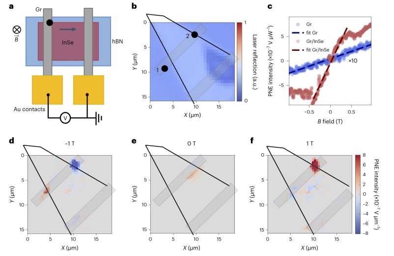 圖3. a、設備示意圖,顯示 Gr/5L-InSe 異質結構的照明和 InSe 通道上的電檢測。b、與掃描光電壓圖同時測量的感興趣區域的激光反射圖。通過此測量,我們可以將激光的位置與觀察到的信號關聯起來。選擇用于記錄石墨烯和 Gr/InSe 異質結構上的能斯特效應信號的位置分別標記為位置 1 和 2。c、通過改變磁場并在位置 1 和 2 下在 50 µW 激光照射和 Vg = 0 V 下記錄能斯特效應信號,分別照射在石墨烯電極和異質結構上。裸露的石墨烯信號以藍色顯示,乘以 10 以更好地突出顯示兩條曲線之間的斜率差異。測量是在沒有施加任何偏置的情況下進行的,因為它會掩蓋能斯特效應,從而在圖片中引起其他光電壓機制。 d、掃描光電壓圖顯示在施加的平面外電場為 –1 T 時測量到的整個器件的光電壓。此處的溫度梯度沿著石墨烯電極的方向,與磁場和測量電位正交。e、f、顯示的 0 T(e)和 1 T(f)的掃描光電壓圖。b、d-f 中的矩形表示石墨烯接觸。