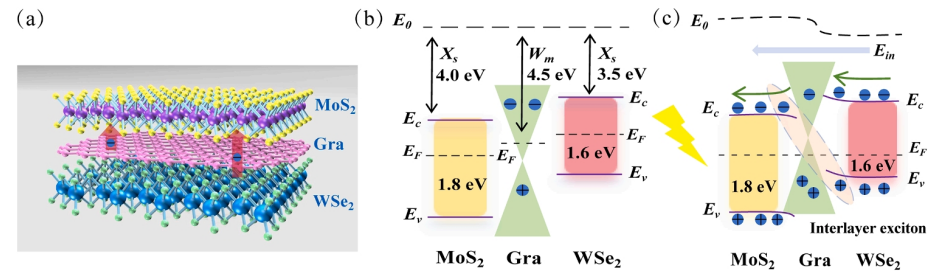 圖1. (a) MoS2/Gra/WSe2 vdWHs示意圖,其中層間電子轉移方向用紅色箭頭表示。(b) MoS2/Gra/WSe2平帶模型示意圖,(c) MoS2/Gra/WSe2異質結平衡態示意圖。