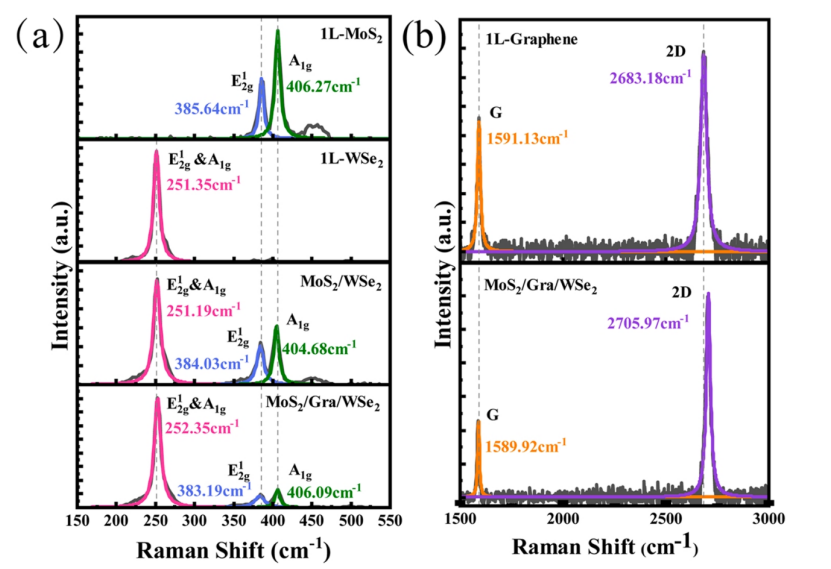 圖2. 室溫下532 nm激光激發下1L-MoS2、1L-WSe2、1L -石墨烯、MoS2/WSe2和MoS2/Gra/WSe2薄膜的拉曼光譜,(a)光譜范圍為150 cm-1 ~ 550 cm-1,(b)光譜范圍為1500 cm-1 ~ 3000 cm-1