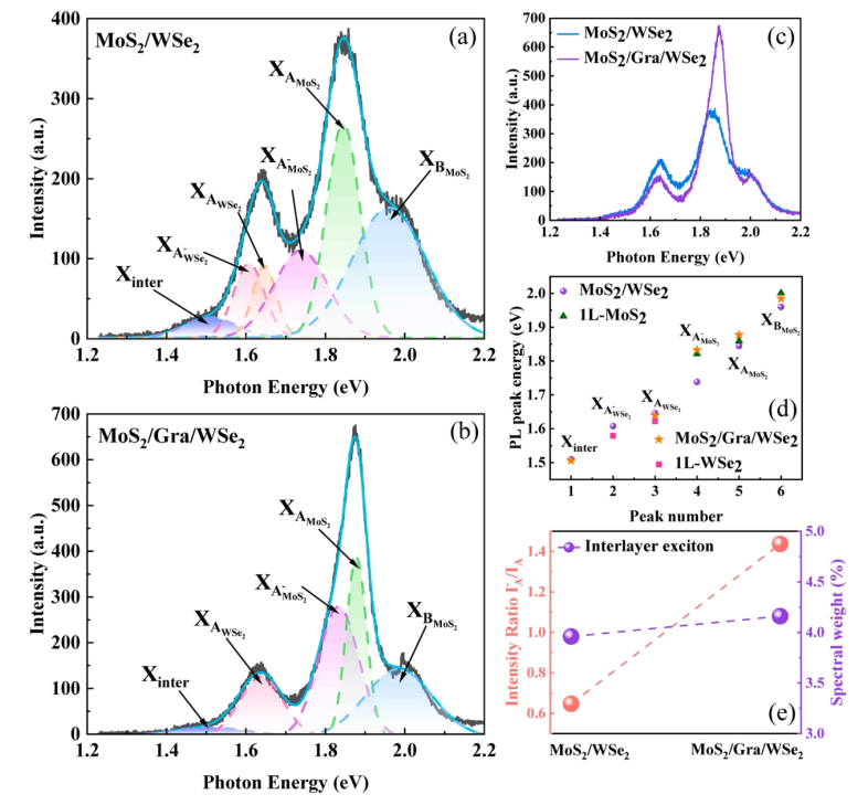 圖3. (a) MoS2/WSe2和(b) MoS2/Gra/WSe2 vdWHs的PL光譜。(c) MoS2/WSe2和MoS2/Gra/WSe2的PL光譜比較。(d) 1L-MoS2、1L-WSe2、MoS2/WSe2和MoS2/Gra/ WSe2的PL峰位置分布。(e) MoS2的三激子和A激子強度比和MoS2/WSe2和MoS2/Gra/WSe2中層間激子的譜權,其中層間激子的譜權由vdWHs的層間激子強度與總強度之比計算得到。