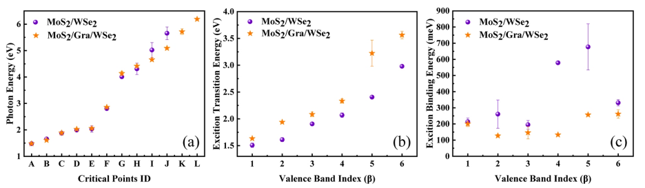二維材料和異質結在下一代集成光電探測器領域具有非凡的潛力。近年來,在范德華異質結中插入石墨烯(Gra)作為傳輸層已被證明是提高光電探測器響應率和響應速度的有效方法。然而,石墨烯的插入引起的物理機制(層間耦合和電子轉移)如何調節其光學性質尚不明確。同時,還應仔細驗證石墨烯的插入是否會調制異質結的寬帶光學特性。利用橢圓偏振光譜研究了MoS2/WSe2和MoS2/Gra/WSe2的寬帶(1.25 ~ 6.50 eV)電子帶結構和激子性質,同時利用拉曼光譜和PL光譜輔助分析。研究發現石墨烯的插入不僅促進了WSe2向MoS2的自發電荷轉移,而且有效地將電子注入MoS2層,有利于MoS2層間電荷分離和凈電荷積累。其次,帶邊緣附近的CP能量穩定,表明石墨烯的插入不會改變MoS2/WSe2的電子帶結構。此外,由于石墨烯插入引起的有效介電屏蔽增加,激子結合能隨之紅移,激子躍遷能隨之藍移。
