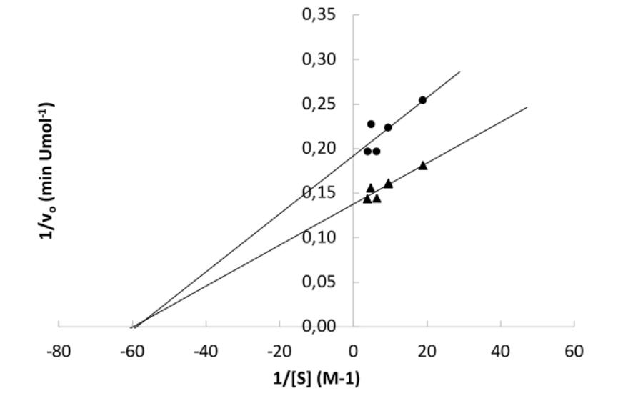 圖2. 不存在氧化石墨烯(三角形)和存在25 ppm氧化石墨烯(圓圈)時的Lineweaver-Burk圖。直線對應于線性擬合。