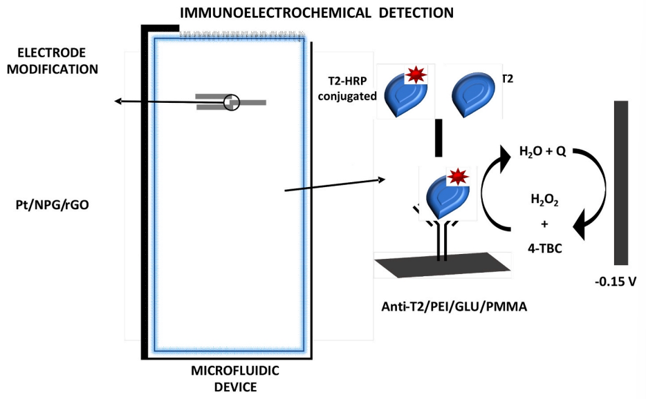 T-2是最有影響力的細胞毒性食源性真菌毒素之一。在這項工作中,我們開發了一種用于小麥胚芽樣品中T-2毒素定量的電化學微流控免疫傳感器并對其進行了表征。T-2毒素檢測采用基于單克隆抗T-2抗體固定在聚甲基丙烯酸甲酯(PMMA)微流控中心通道的競爭性免疫分析法。通道末端的鉑絲工作電極通過還原氧化石墨烯(rGO)-納米孔金(NPG)的單步電沉積工藝進行原位修飾。讓樣品中的T-2毒素與T-2-辣根過氧化物酶(HRP)偶聯物競爭固定抗T-2單克隆抗體的特異性識別位點。在過氧化氫(H2O2)的存在下,HRP催化4-對叔丁基鄰苯二酚(4-TBC)的氧化,在-0.15 V的納米結構電極上檢測到其反向電化學還原。因此,在樣品中的低T-2濃度下,更多的酶偶聯T-2將與捕獲的抗體結合,因此,預計會有更高的電流。電化學免疫傳感器法和商用ELISA法的檢出限分別為0.10 μg kg-1和10 μg kg-1,測定內變異系數和測定間變異系數分別小于5.35%和6.87%。最后,我們的T-2毒素微流控免疫傳感器將大大有助于更快,直接和安全的農業樣品原位分析。