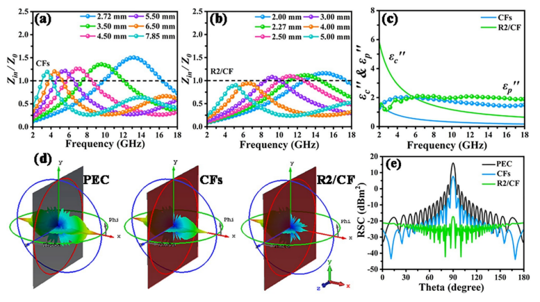 Fig 7. a-c CFs 和 R2/CF 的阻抗-f 曲線、 εc′′, εp′′ 值,以及 d、e PEC、CFs 和 R2/CF 的 3D RCS 仿真和 0-180° 入射角時的模擬 RCS 值。