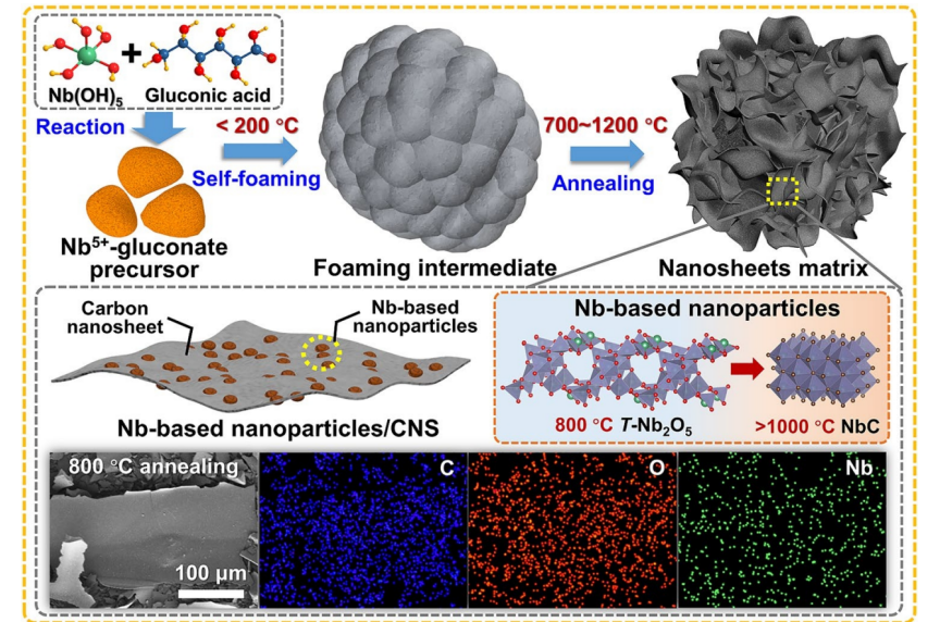 Fig 1. 二維 Nb2O5 和 NbC 納米粒子/碳納米片復合材料的合成示意圖。