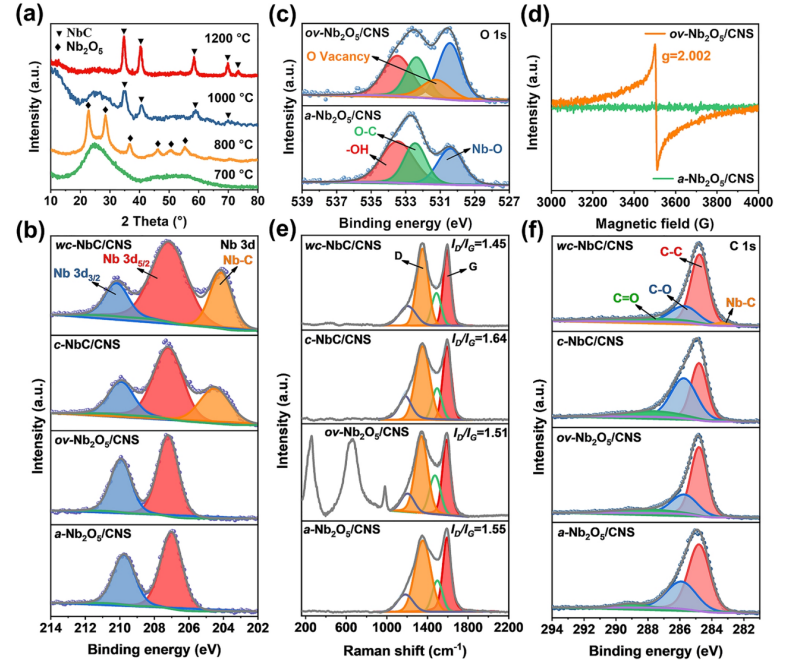 Fig 3. (a) x射線衍射(XRD)圖和(b)高分辨率Nb 3d XPS譜圖;(c) a- Nb?O?/CNS和ov- Nb?O?/CNS的高分辨率O 1s XPS譜圖和(d)EPR譜圖;所有樣品的(e)拉曼光譜和(f)高分辨率C 1s XPS譜圖。
