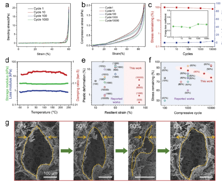 圖3. a) GNFA在1000次疲勞循環下的彎曲應變-應力曲線。b) 1萬次疲勞循環下GNFA壓縮應變-應力曲線。c)剩余應力、塑性變形和能量損失系數相對于壓縮循環。d)當振蕩壓縮應變為3%時,CNFAs的存儲模量、損耗模量和阻尼比隨溫度從- 50°C到250°C的變化。e)納米纖維氣凝膠材料的塑性變形與彈性應變。圖中相應的圓點旁標示了壓縮循環的次數。f)納米纖維氣凝膠材料的剩余應力與壓縮循環。壓縮應變在圖中相應的圓點旁邊標有。g)最大壓縮應變為90%時GNFA的原位SEM觀察。