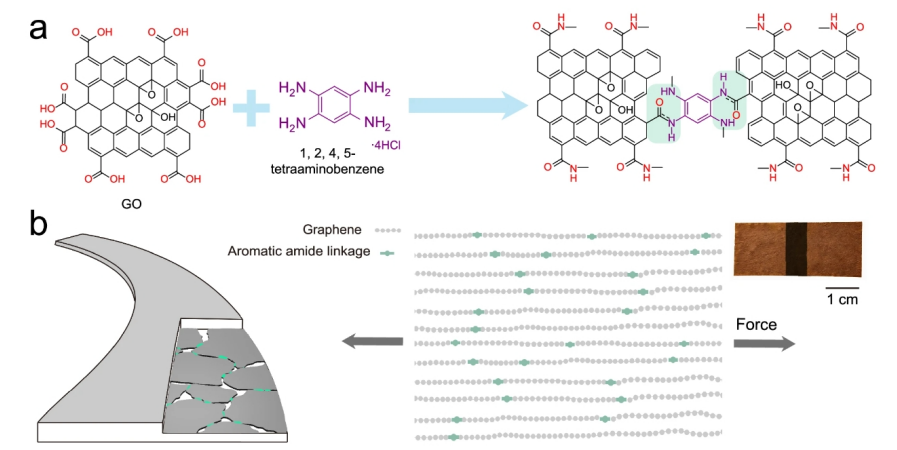 圖1. 原理圖顯示了裝配過程的原理。平面內芳香酰胺鍵是由氧化石墨烯(GO)薄片的邊緣羧基與芳香胺的選擇性反應產生的,綠色陰影區域突出顯示。氧化石墨烯和酸催化直接酰胺化。