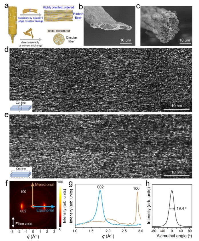 圖2. 通過選擇性邊緣連接,將GO片組裝成具有高度定向和有序堆疊結構的帶狀宏觀纖維的過程示意圖。為便于比較,還舉例說明了GO片無序組裝成具有通常觀察到的圓形截面的纖維,由于沒有約束,這復制了針的幾何結構。(b)具有酰胺橋的纖維和(c)對照纖維的典型橫截面SEM圖像。(d)酰胺連接纖維的橫截面切片和(e)橫截面切片的代表性HR-TEM圖像。石墨烯纖維的二維WAXS衍射圖。赤道和經向散射方向用青色和棕色箭頭表示。顏色條是指以任意單位表示的強度。g(002)峰的(f,h)方位掃描積分曲線的赤道軸和經向軸積分得到相應的一維散射剖面。