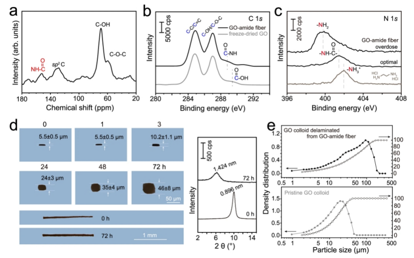 圖3. 酰胺連接GO纖維的固態13C交叉極化NMR譜。凍干GO和酰胺連接GO纖維的b XPS C 1s光譜,(C)最佳酰胺連接GO纖維的N 1s光譜。為了標記N的類型,還顯示了用過量胺和脂肪族銨鹽制造的纖維的數據。酰胺連接GO纖維在NMP中軸向和堆積方向溶脹的三維光學圖像;右面板:纖維的XRD圖案。各向異性溶脹和較長的溶脹時間證實了在邊緣存在選擇性酰胺鍵和增強的π-π相互作用。誤差條對應于來自至少15個位置的獨立測量的統計誤差。用激光衍射法對膨脹的酰胺橋聯GO纖維和原始GO纖維分層片的膠體進行了粒度分布比較。