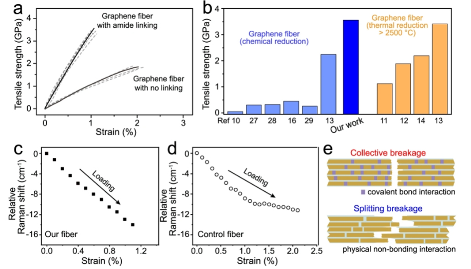 圖4. 石墨烯纖維化學還原前后的應力-應變曲線;虛線是副本數據。b機械強度與文獻中報告值的比較。(c)酰胺橋聯石墨烯纖維和(d)未連接的控制纖維的拉曼G帶頻率下降與外加載應變的關系。酰胺連接石墨烯纖維的集體斷裂機制和純物理非鍵相互作用的控制纖維的分裂斷裂機制。