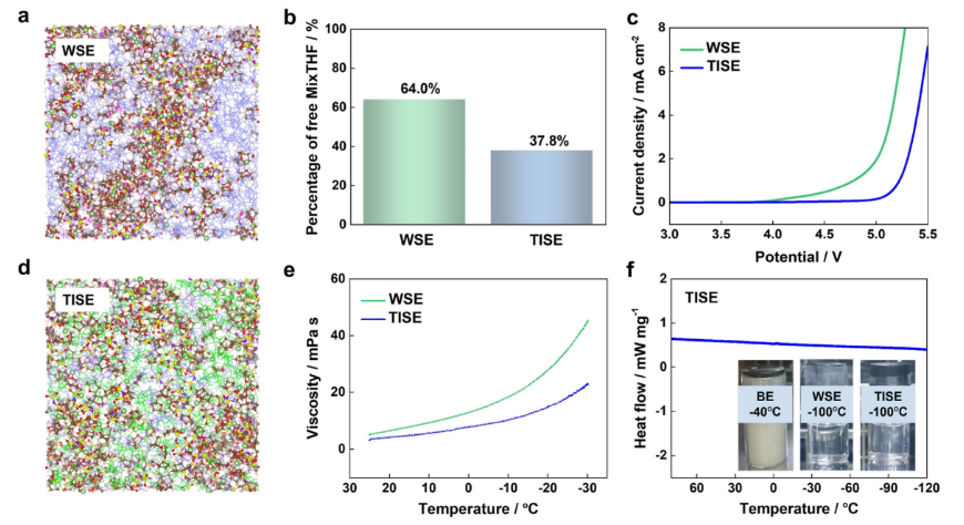 –(紅色)和自由TTE共溶劑(綠色)。(b) WSE和TISE總溶劑中游離溶劑的百分比。(c) Pt | Li電池在WSE和TISE中的線性掃描伏安(LSV)曲線。(e) WSE和TISE的粘度-溫度曲線。(f) 差示掃描量熱法(DSC)曲線的TISE和液體狀態的BE,WSE,和TISE在低溫。