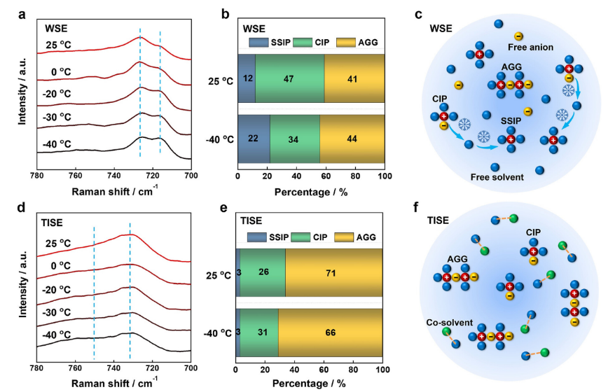 –1范圍內FSI–振動的S–N–S彎曲模的變溫拉曼光譜。根據25℃和−40℃下的分子動力學模擬,WSE(b)和TISE(e)的SSIP/CIPs/AGG百分比。WSE(e)和(f)TISE在降溫過程中的溶劑化轉變機制示意圖。
