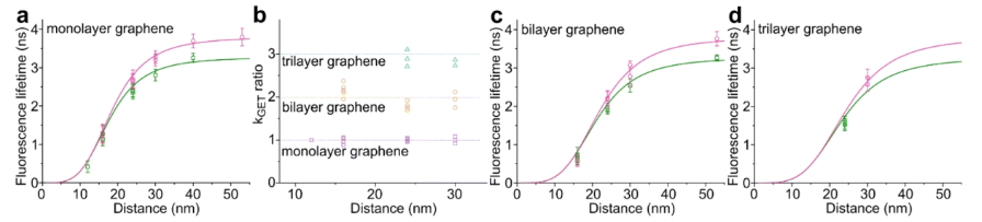 圖2. DNA折紙納米結(jié)構(gòu)中共定位染料分子熒光壽命測量的平均值和標(biāo)準(zhǔn)偏差。研究了ATOT542(綠色)和ATOT647N(品紅)與距離的函數(shù)關(guān)系:(a)單層,(c)雙層和(d)三層石墨烯。(b) 多層石墨烯與單層石墨烯的能量轉(zhuǎn)移率之比作為距離的函數(shù)。綠色(ATTO542)和品紅(ATTO647N)曲線(a、c和d),作為石墨烯和發(fā)射極之間距離d的函數(shù),其中d0是50%猝滅效率的距離,綠色染料等于17.7±0.5 nm,紅色染料等于18.5±0.7 nm, n是石墨烯層數(shù),τref是固定在玻璃上的DNA折紙納米結(jié)構(gòu)測量的熒光壽命參考值,ATTO542等于3.27±0.19 ns,ATTO647N等于3.81±0.15 ns是的。