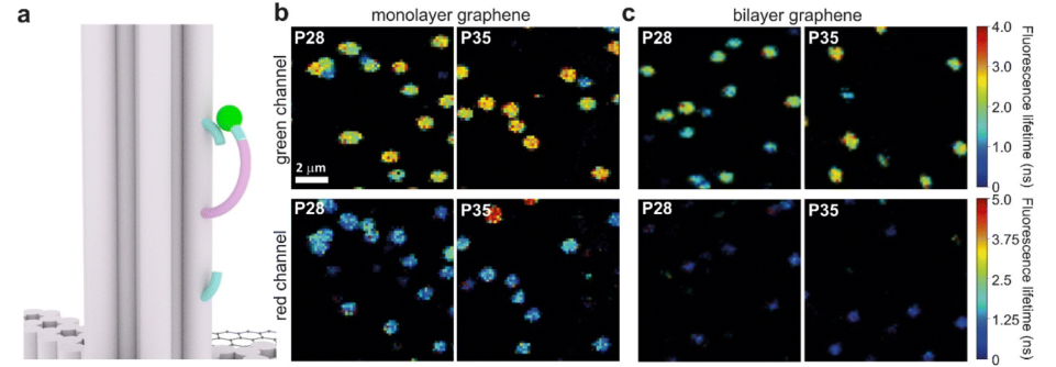 圖3. (a) 包含在柱狀DNA折紙納米結(jié)構(gòu)中的動態(tài)分析圖,其中ssDNA指針P35(紫色+綠松石色)的標(biāo)記位置位于距底物表面35 nm的高度處,標(biāo)記有染料分子Cy3B(綠色球體),通過7個核苷酸與位于指針上方和下方7 nm處的兩個結(jié)合位點(diǎn)(綠松石色)互補(bǔ)。在固定于(b)單層和(c)雙層石墨烯上的DNA折紙納米結(jié)構(gòu)中,獲得位于28 nm(P28)或35 nm(P35)高度、用染料Cy3B(綠色通道,上面板)標(biāo)記的指針的(b和c)示例熒光壽命強(qiáng)度圖(10×10μm)。在所有結(jié)構(gòu)中,位于16 nm高度(圖上未標(biāo)記)的ATO647N用作內(nèi)部參考,以監(jiān)測石墨烯的質(zhì)量(紅色通道,下部面板)。