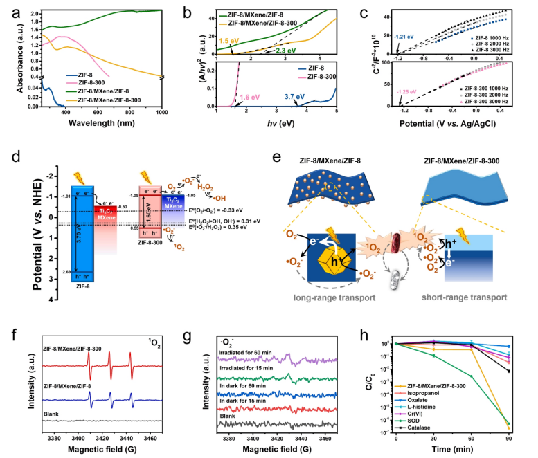 Fig 5. (a-b)ZIF-8、ZIF-8-300、ZIF-8/MXene/ZIF-8 和 ZIF-8/MXene/ZIF-8-300 的紫外可見 DRS 光譜(a)和陶氏圖(b)。(c) ZIF-8 和 ZIF-8-300 的莫特-肖特基圖。(d) ZIF-8/MXene/ZIF-8 和 ZIF-8/MXene/ZIF-8-300 的帶狀結構。(e) ZIF-8/MXene/ZIF-8 和 ZIF-8/MXene/ZIF-8-300 上可能的 ROS 形成過程示意圖。(f) 在模擬陽光照射 60 分鐘后,ZIF-8/MXene/ZIF-8 和 ZIF-8/MXene/ZIF-8-300 的 1O2 的 EPR 光譜。 (g) 在有和沒有模擬陽光照射的情況下,ZIF-8/MXene/ZIF-800 的 ⋅O2- 的 EPR 光譜。(h) ZIF-8/MXene/ZIF-8-300 與清除劑的光催化消毒性能。誤差條通過重復測量三次計算得出。