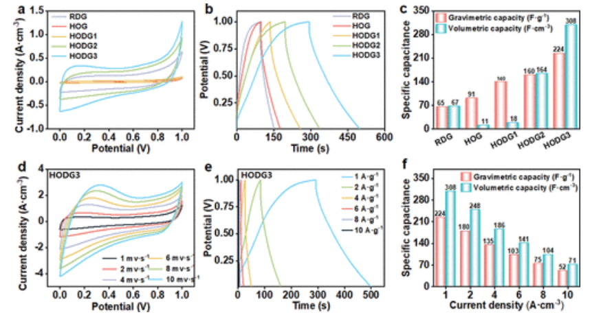 -1 時 0-1.0 V 電位范圍內的 GCD 曲線;(c) RDG、HOG 和 HODGs 電極的重量電容和體積電容。(d) 不同掃描速率下的 CV 曲線,(e) 0-1.0 V 電位范圍內不同電流密度下的 GCD 曲線,以及 (f) HODG3 電極不同電流密度下的重力電容和體積電容。