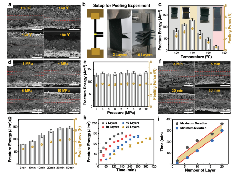 Fig 3. a) 在不同溫度下加工的 LIG-TPU-LIG 試樣的截面 SEM 圖像。 b) 剝離實(shí)驗(yàn)的示意圖和照片。d) 在不同壓力下加工的 LIG-TPU-LIG 試樣的橫截面 SEM 圖像和 e) 斷裂能。 f) 在不同持續(xù)時(shí)間下加工的 LIG-TPU-LIG 試樣的橫截面 SEM 圖像和 g) 斷裂能。 h) 6 至 20 層不同試樣的斷裂能與熱壓持續(xù)時(shí)間之間的關(guān)系。