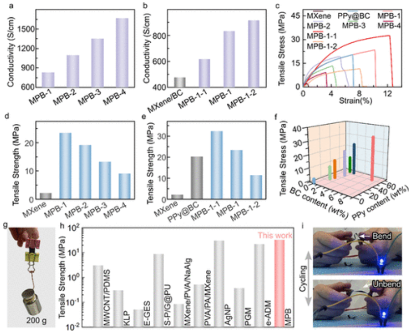 圖 2. (a)具有不同MXene比例的不同電子表皮的電導率。(b)具有不同PPy比例的不同電子皮膚的電導率。(c)不同電子皮膚和對照的應力-應變曲線。(d)具有不同MXene比例和對照的不同電子皮的拉伸強度。(e)具有不同PPy比例和控制的不同電子皮膚的拉伸強度。(f)說明拉伸強度、PPy重量%和BC重量%之間關系的3D圖。(g)展示電子皮膚在200克重量下的機械強度的光學圖像。(h)本研究中的電子皮膚與其他報道的電子皮膚材料的拉伸強度比較。b、d和e部分中的灰色數據點對應于相應的對照。(I)通過在循環彎曲測試期間點亮一個商業LED來展示電子皮膚的導電性和柔韌性的光學圖像。
