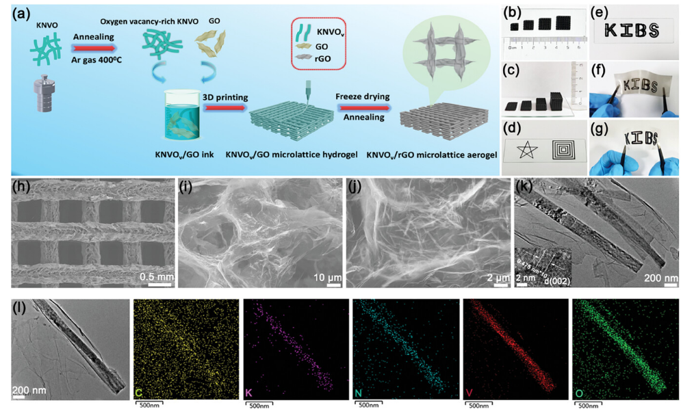 圖 1. a) 3D 打印 KNVOv/rGO 微晶格氣凝膠電極制造過(guò)程示意圖。b、c) 數(shù)碼照片顯示打印的整料具有不同的尺寸和層數(shù):0.6 × 0.6、0.8 × 0.8、1.0 × 1.0 和 1.2 × 1.2 cm2;可調(diào)節(jié)厚度包括 3、6、12 和 24 層。d) 通過(guò) 3D 打印技術(shù)打印各種圖案。e-g) 分別打印在硬玻璃、柔性多孔不銹鋼箔和聚對(duì)苯二甲酸乙二醇酯 (PET) 上的設(shè)計(jì)字母 (KIBS) 圖案。h-j) 不同放大倍數(shù)下的 KNVOv/rGO 微晶格氣凝膠的 SEM 圖像。k) KNVOv/rGO 納米復(fù)合材料的 TEM 圖像,插圖顯示 KNVOv 納米帶的 HR-TEM 圖像。 l)rGO包裹的單個(gè)KNVOv納米帶的TEM圖像及其相應(yīng)的EDS圖。