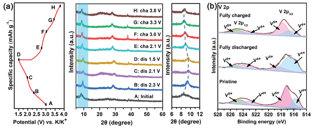 圖 4. KNVOv/rGO微晶格氣凝膠的儲(chǔ)鉀機(jī)理。a)第一次循環(huán)的非原位XRD圖譜。b)不同狀態(tài)下v2p的離地高分辨率XPS光譜。