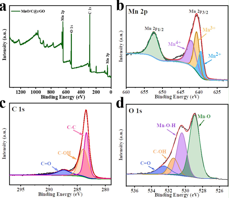圖2. MnO/C@rGO復合材料的XPS光譜:a)測量光譜和高分辨率光譜,b) Mn 2p, c) C 1s, d) O 1s光譜。