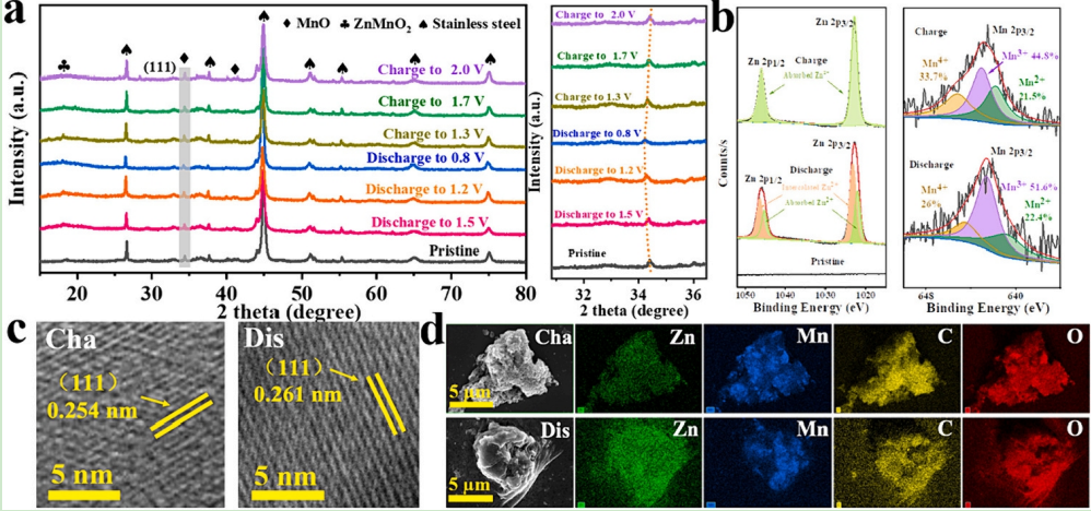 圖5. a)非原位XRD測試。b)完全充放電時的XPS光譜。c)充、放電后MnO/C@rGO的HRTEM圖像。d) MnO/ C@rGO在完全充放電狀態下的EDS圖像。