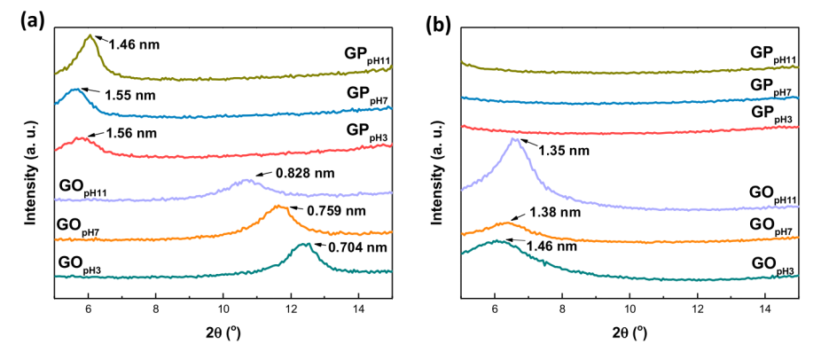 圖4. pH 調節后的 GO 和 GP 膜在 (a) 干態和 (b) 濕態下的 XRD 光譜。