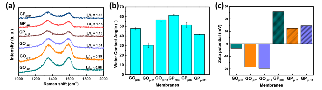 圖5. pH 調節的 GO 和 GP 膜的(a) 拉曼光譜、(b) 水接觸角、以及 (c)  zeta 電位。