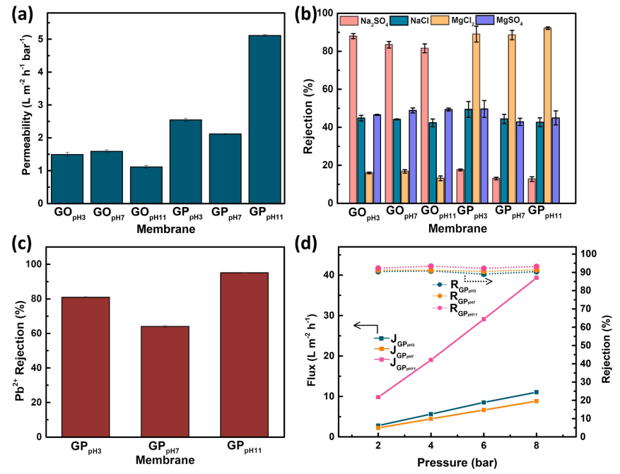 氧化石墨烯(GO)膜由于其優越的物理化學性質,在分離各種離子和分子方面得到了廣泛的研究和應用。然而,它們的孔結構不一致,難以精確調節它們的d-間距,以及在水溶液中的不穩定性-特別是在極端pH值下-可能會阻礙它們的分離效率。在這項研究中,我們系統地研究了pH介導的氧化石墨烯膜的制備過程,并評估了所得膜的性能。掃描電鏡(SEM)和X-射線衍射(XRD)分析結果表明,較高的制備pH會導致氧化石墨烯層更厚,并且由于氧化石墨烯的羧基去質子化而導致d-間距增大。此外,pH輔助下,聚乙烯亞胺(PEI)和氧化石墨烯(GO)薄片之間的交聯得到了促進,化學分析結果表明,在酸性環境下,主要反應是在基面上形成C-N鍵,而在堿性條件下,在邊緣形成N-C=O(酰胺)鍵更為普遍。反過來,這相應地改變了SEM和XRD的趨勢,在較高的制造pH下,由于摻入PEI的胺基的去質子化,可觀察到更薄的GP層和更小的d-間距。這些發現有助于膜對不同無機鹽和重金屬離子的納濾(NF)性能。發現在pH為11時形成的GPpH11膜對Pb2+的去除率最高,>95%,是去除重金屬離子的理想材料。