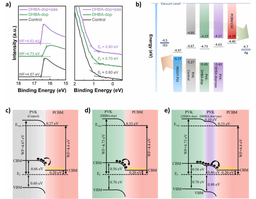 Fig 5. 鈣鈦礦/ETL 界面處的電子傳輸研究。(a) 在 −10 V 的偏置下測(cè)量的鈣鈦礦的 UPS 光譜。(b) 三個(gè) TLP 的器件能級(jí)圖。(c-e) ETL 和 (c) 控制、(d) DHBA-dop 和 (e) DHBA-dop+pas TLP 之間界面的能帶彎曲示意圖。所有 TLP 薄膜均在 ITO/PEDOT:PSS 襯底上制造。