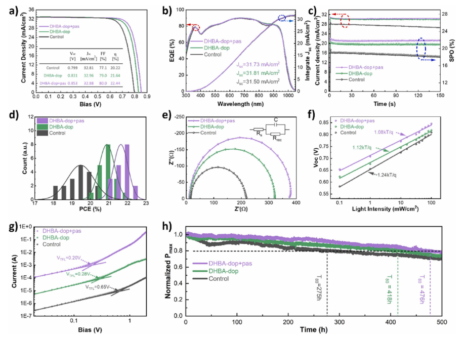 具有可調(diào)諧和理想帶隙的錫鉛混合鈣鈦礦 (TLP) 在接近功率轉(zhuǎn)換效率 (PCE) 的 Shockley-Queisser 極限方面表現(xiàn)出巨大的潛力。然而,需要解決兩個(gè)關(guān)鍵問題,包括 Sn2+ 的氧化和可忽略不計(jì)的成分和相偏析。后者源于 Sn 基和 Pb 基鈣鈦礦之間的不平衡結(jié)晶速率。在本文中,作者報(bào)告了一種通過在 TLP 前驅(qū)體溶液中引入 3,4-二羥基芐胺氫溴酸鹽 (DHBABr) 來解決上述關(guān)鍵問題的策略。DHBABr 通過抑制結(jié)晶 DMSO-FA-Pb-I 中間體的形成來促進(jìn) FAPbI3 鈣鈦礦的結(jié)晶,并通過優(yōu)先形成穩(wěn)定的無定形 DHBA-FA-Sn-I 中間體來延緩 FASnI3 的結(jié)晶速率。因此,這平衡了 Sn 基和 Pb 基鈣鈦礦之間的結(jié)晶速率。因此,Sn/Pb 比率的空間分布在整個(gè) TLP 薄膜中更加均勻,這有利于制造工藝的放大。依靠這種摻雜策略伴隨著 DHBABr 的表面鈍化,降低了 TLP 的缺陷密度,抑制了 Sn2+ 的氧化,并優(yōu)化了器件的波段對(duì)準(zhǔn),我們?cè)?em>Voc為 0.853 V 和 FF 的情況下實(shí)現(xiàn)了 22.44% 的 PCE,并在 champion 器件的連續(xù)光照下提高了 T80 = 476 h。